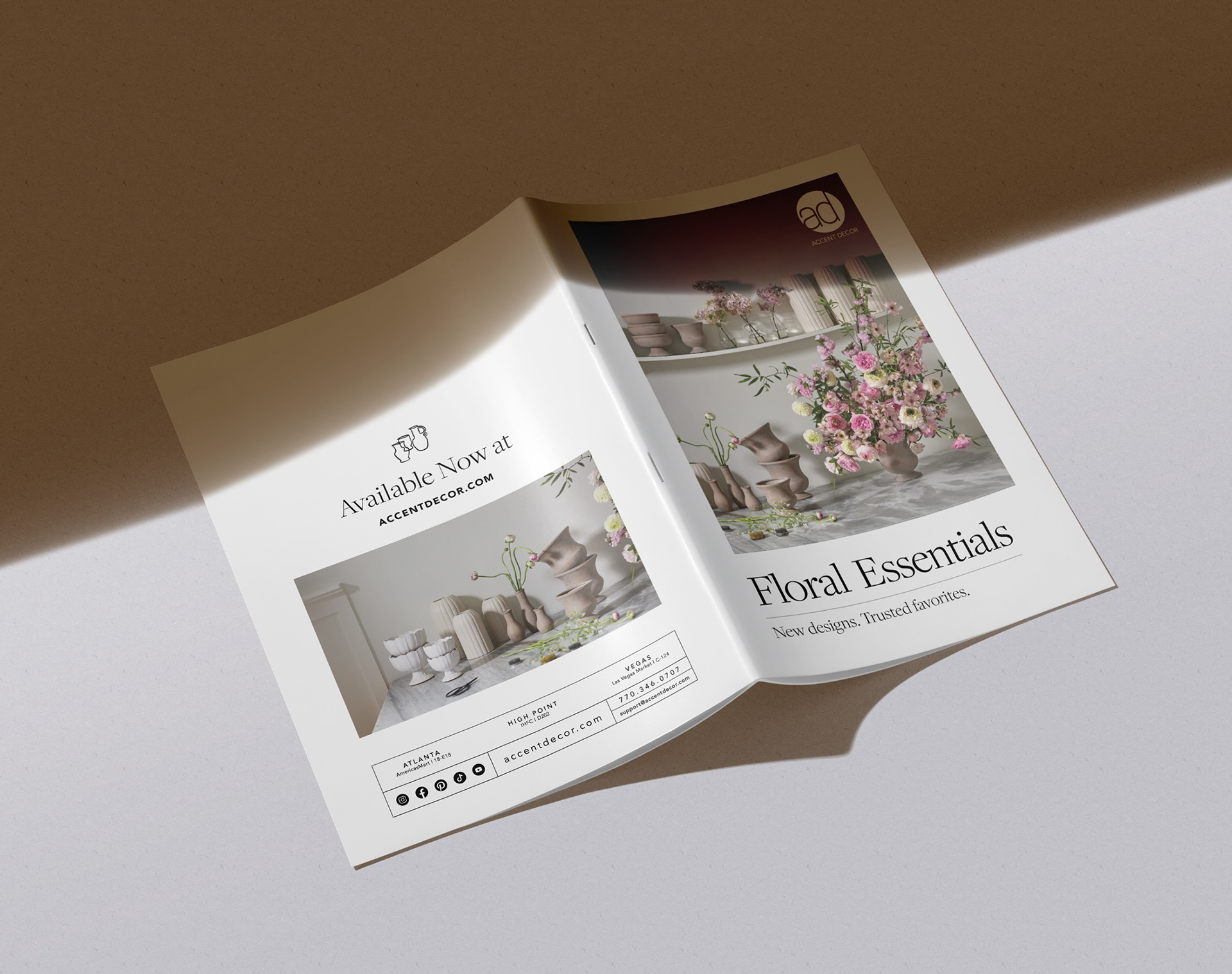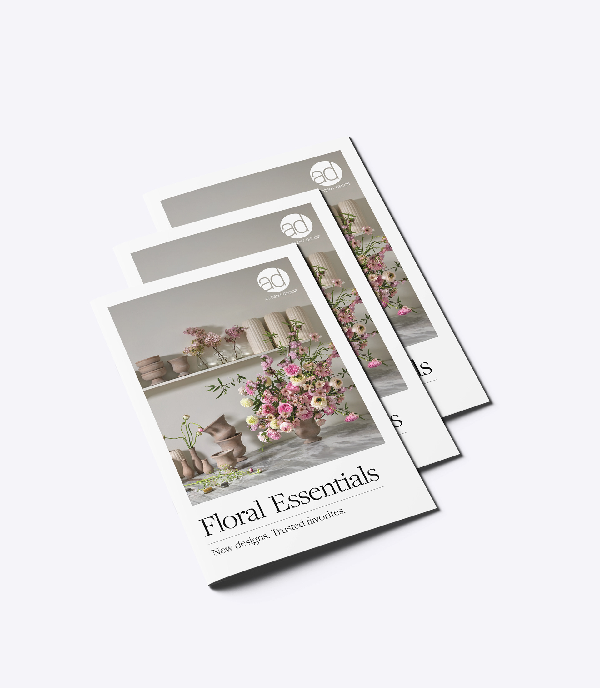 Design comprehensive product catalog for Accent Decor's Floral Essentials line targeting professional florists and wholesale buyers. Needed to increase customer engagement and order value while positioning program as essential resource. Catalog had to balance inspirational photography with functional specifications across 100+ SKUs organized by category.