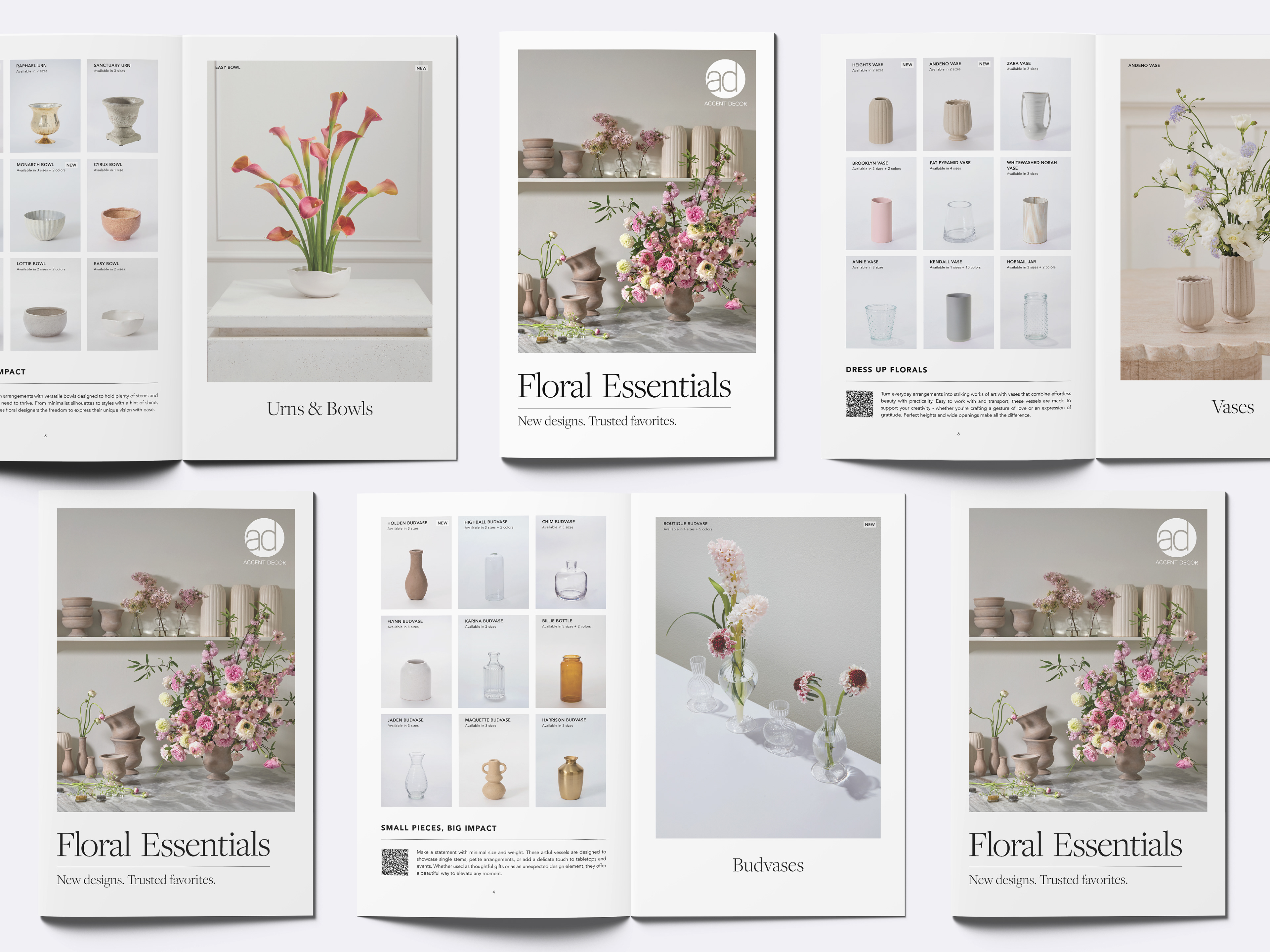 Designed 16-page staple-bound catalog (5×8") organized by product category—budvases, vases, compotes, urns, bowls, pots, planters. Featured styled product photography with clear specifications (sizes, colors, dimensions). Developed typographic hierarchy with category storytelling sections like "Small Pieces, Big Impact" and "Designed for the Designer" connecting products to florist workflows. Integrated QR codes enabling print-to-digital shopping experience.